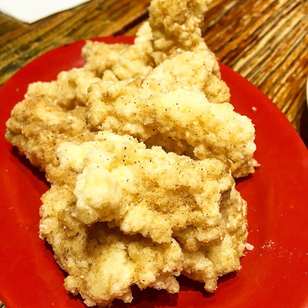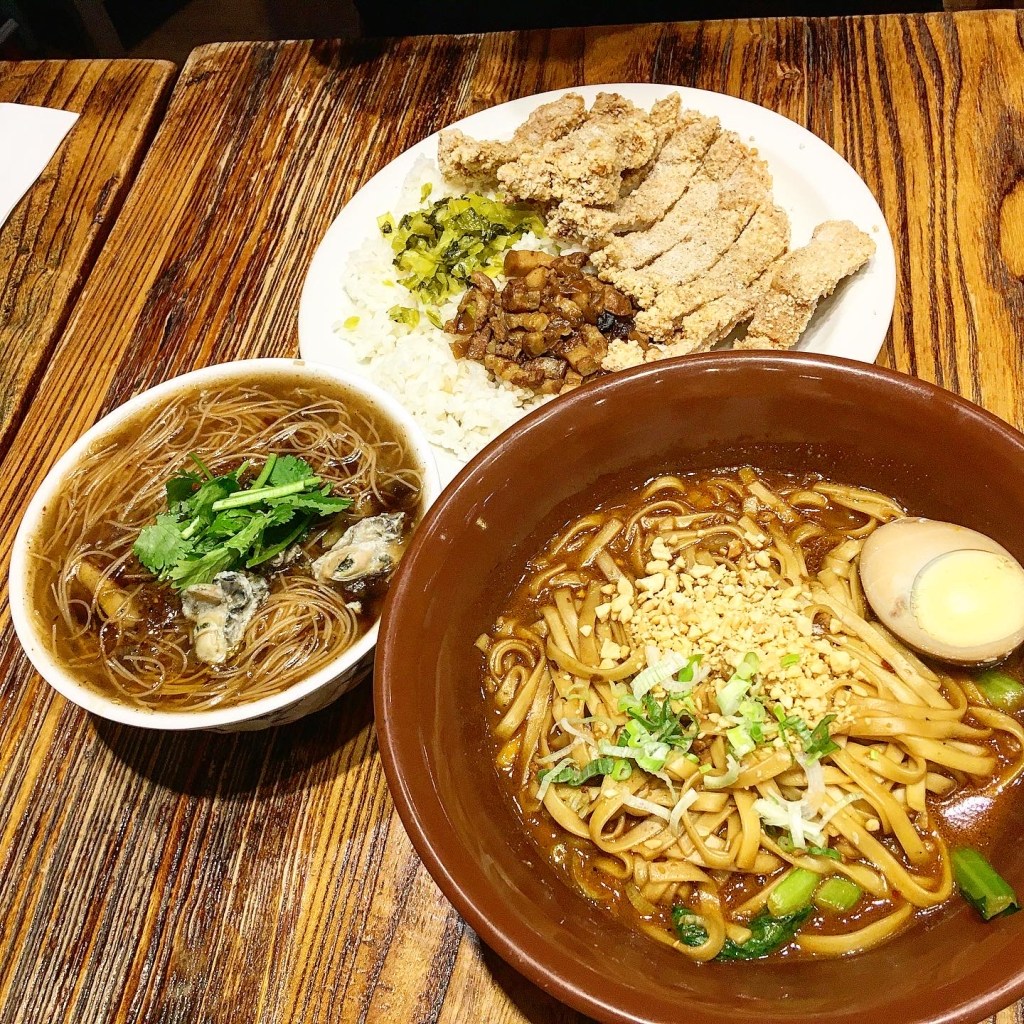 We waited in the queue for about 20 minutes and looked at the menu that was very helpfully next to us, by the shop window, next to where we were queuing. We ordered a few dishes to have individually and thoroughly enjoyed our choices! For our individual meals Alan had deep fried salt & pepper pork chop with rice (which was served with preserved greens and braised pork), I had a very generous bowl of Sichuan dan-dan noodles that had an extremely tasty peanut sauce and the right amount of heat and spice and Yuki had the Old Tree thin noodles soup with oysters which as deceptively small but was incredibly filling! We also ordered a side of Taiwanese style salt and pepper crispy squid which sooooooooo good! It had the right amount of plum favouring sprinkled on it too!