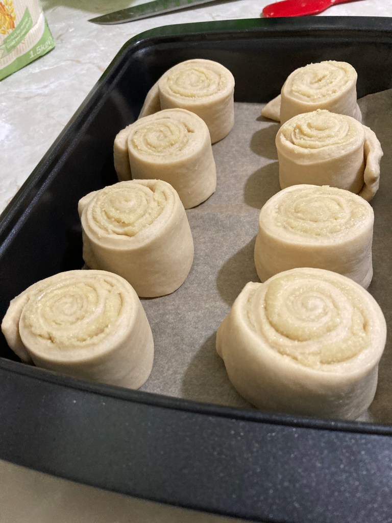 Once you have your sheet, spread the cooled almond paste all over the dough, leaving about an inch at the bottom of the sheet. Roll the dough down towards you as tightly as you can and with a sharp knife, cut your buns from the long stick. This should make about 16 buns.