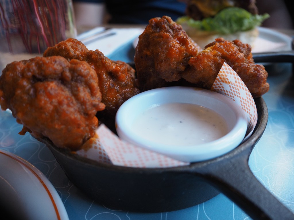 Then we ordered the chicken burgers. There are 6 burgers to choose from the menu. Being the buffalo addict that I was, I ordered the buffalo blue chicken burger. This burger is a battered boneless chicken thigh fillet served on a brioche bun with buffalo sauce and a blue cheese slaw. I don’t think I got a chance to take a photo of Alan’s burger but he ordered a bacon cheese burger.