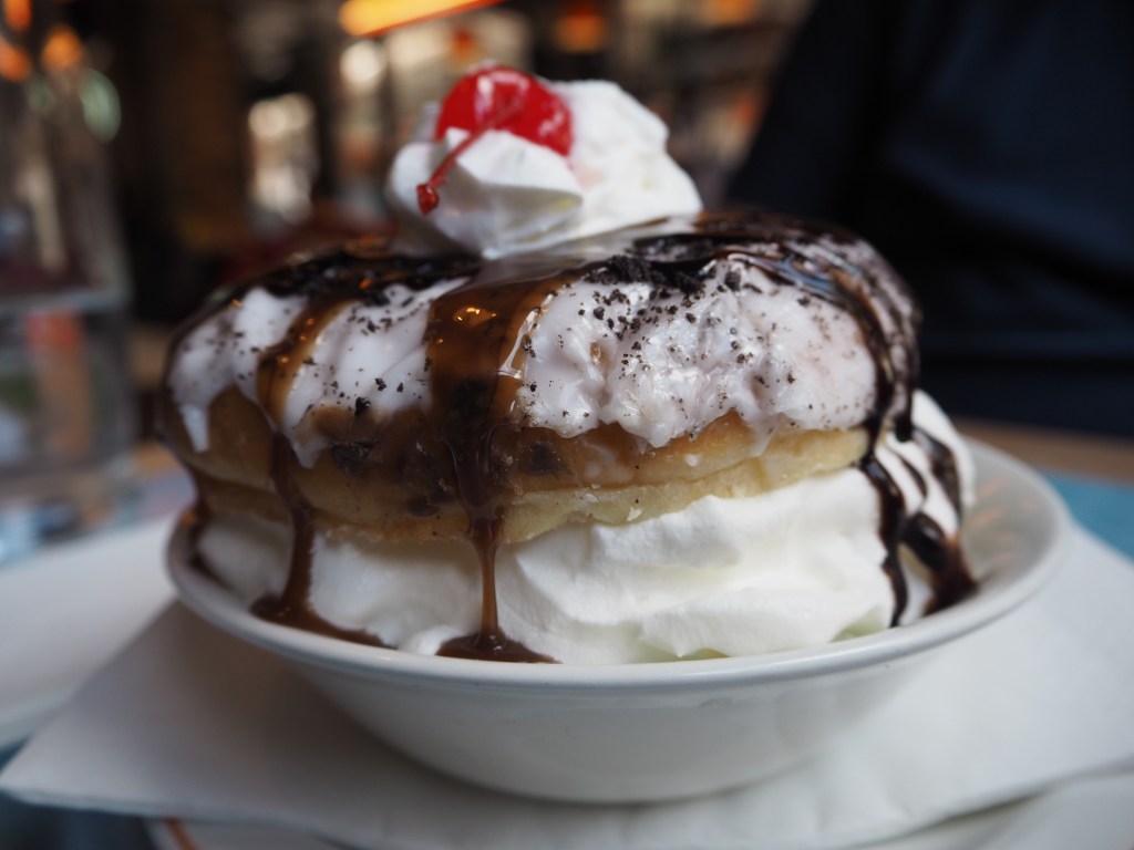 I ordered the daily glazed doughnut special – which was, on the day, a mint chocolate glazed donut. I thought it wouldn’t be as formidable as Alan’s desert of choice, but when my dessert arrived, it was bigger than I thought!