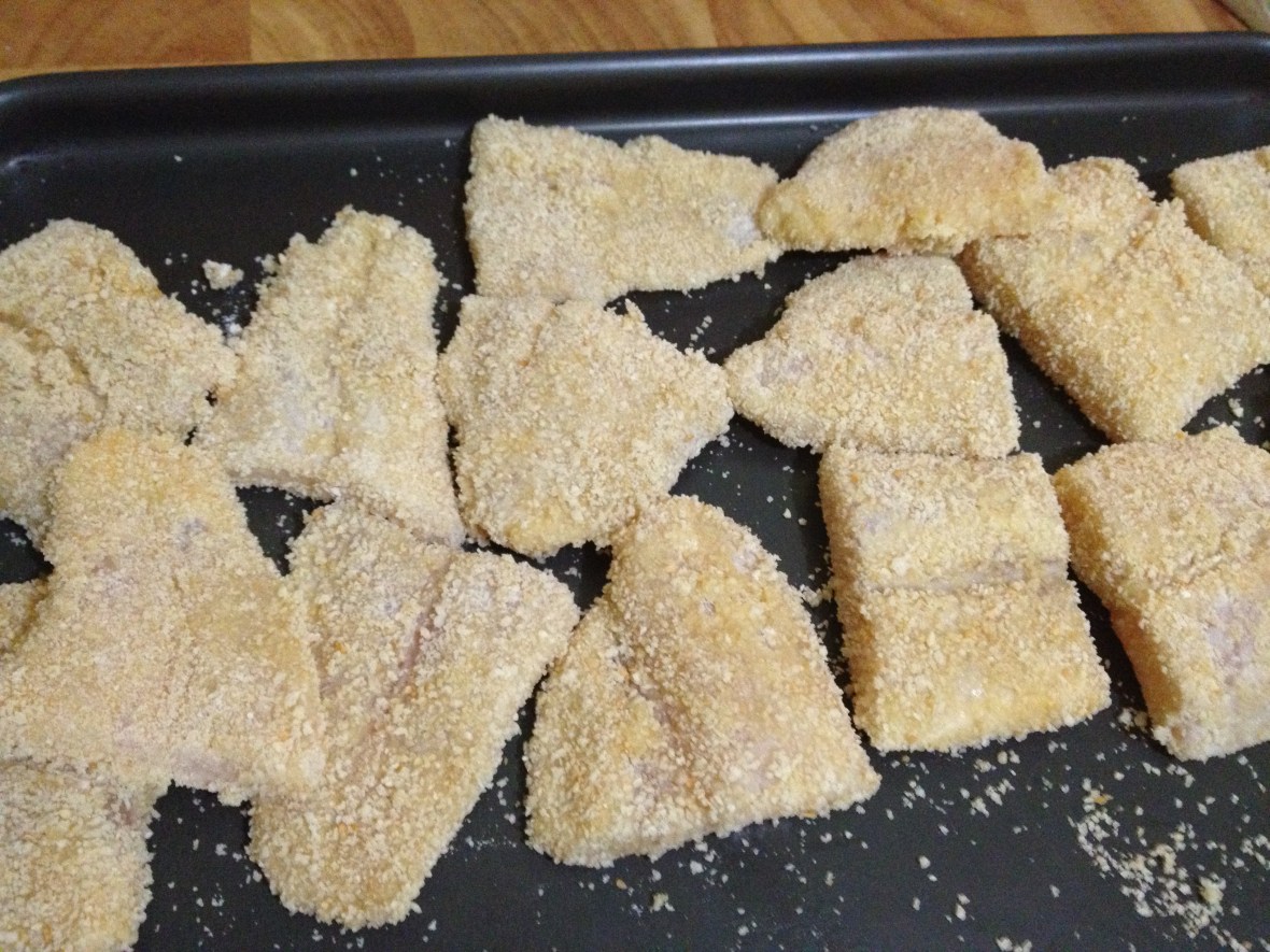 I breaded the fish before I fried them. I sort of love breading anything really. I do a little conveyor belt of the elements bowls of seasoned flour (or cornstarch), beaten egg and breadcrumbs. Depending on what you’re making, seasoned flour to me usually just means salt and pepper mixed in with the flour. One tip I learned from either Nigella or Ina Garten (it was so long ago that I can’t remember! It might even be Giada de Laurentis!) was to use just one hand so that you kept the other hand clean because breading things can be quite gluggy!