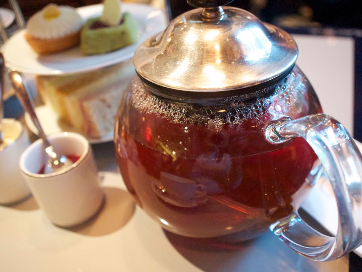 You get a pot of tea, enough milk for your tea, 5 different types of sandwiches, 2 different cakes, a scone and clotted cream and jam. Everything is presented very beautifully on a 3-tiered cake stand and glass tea pot. You get to choose your tea. I love a good strong tea, but apparently, traditionally (and I could be wrong!), you should choose Earl Grey or English Breakfast. Only recently have I learned that Assam is also a good tea to choose for afternoon tea as its strong flavour compliments the savoury and sweet elements from the food served.