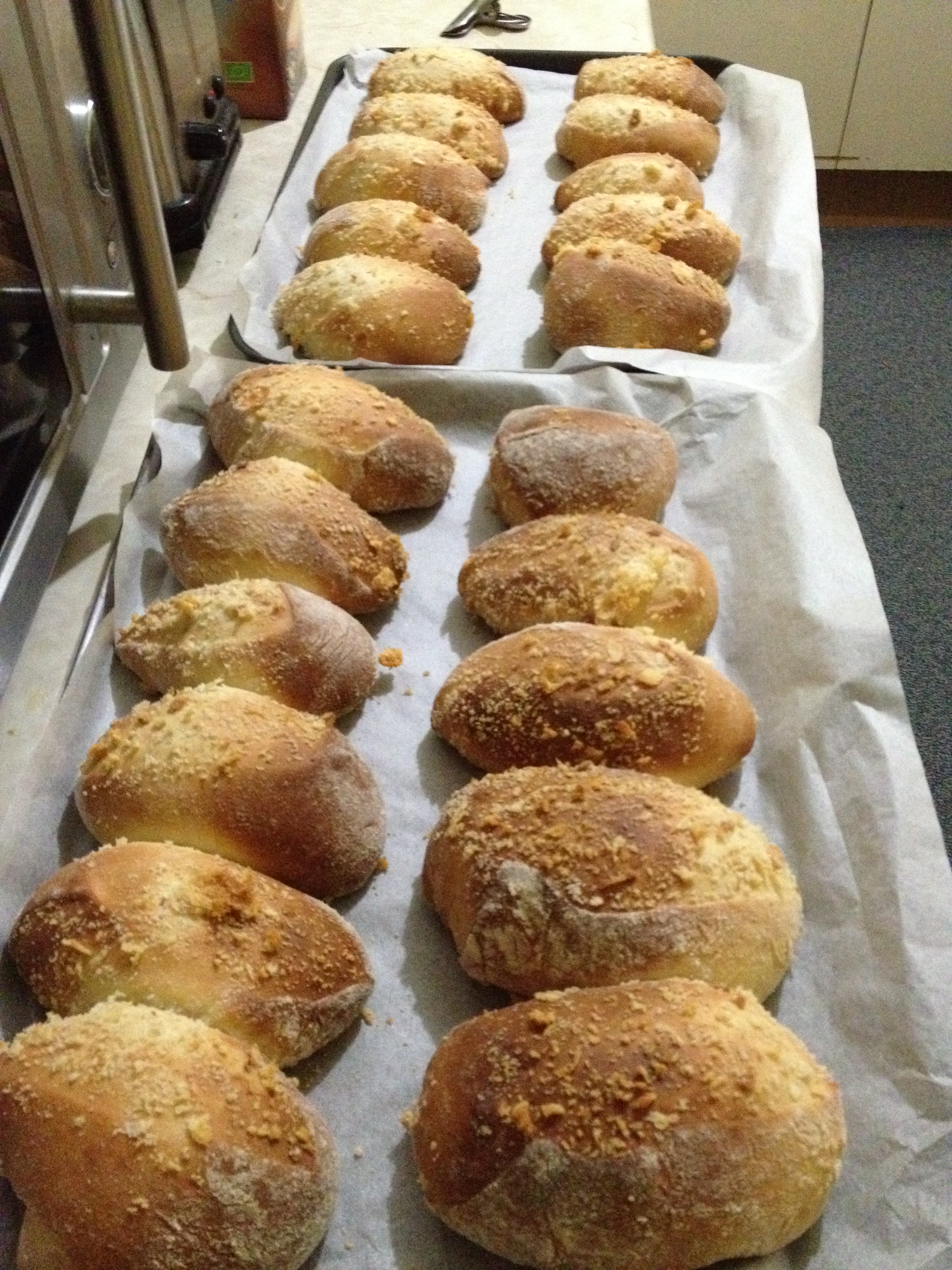 - Once you have your sheet, spread the cooled almond paste all over the dough, leaving about an inch at the bottom of the sheet. Roll the dough down towards you as tightly as you can and with a sharp knife, cut your buns from the long stick. This should make about 16 buns.