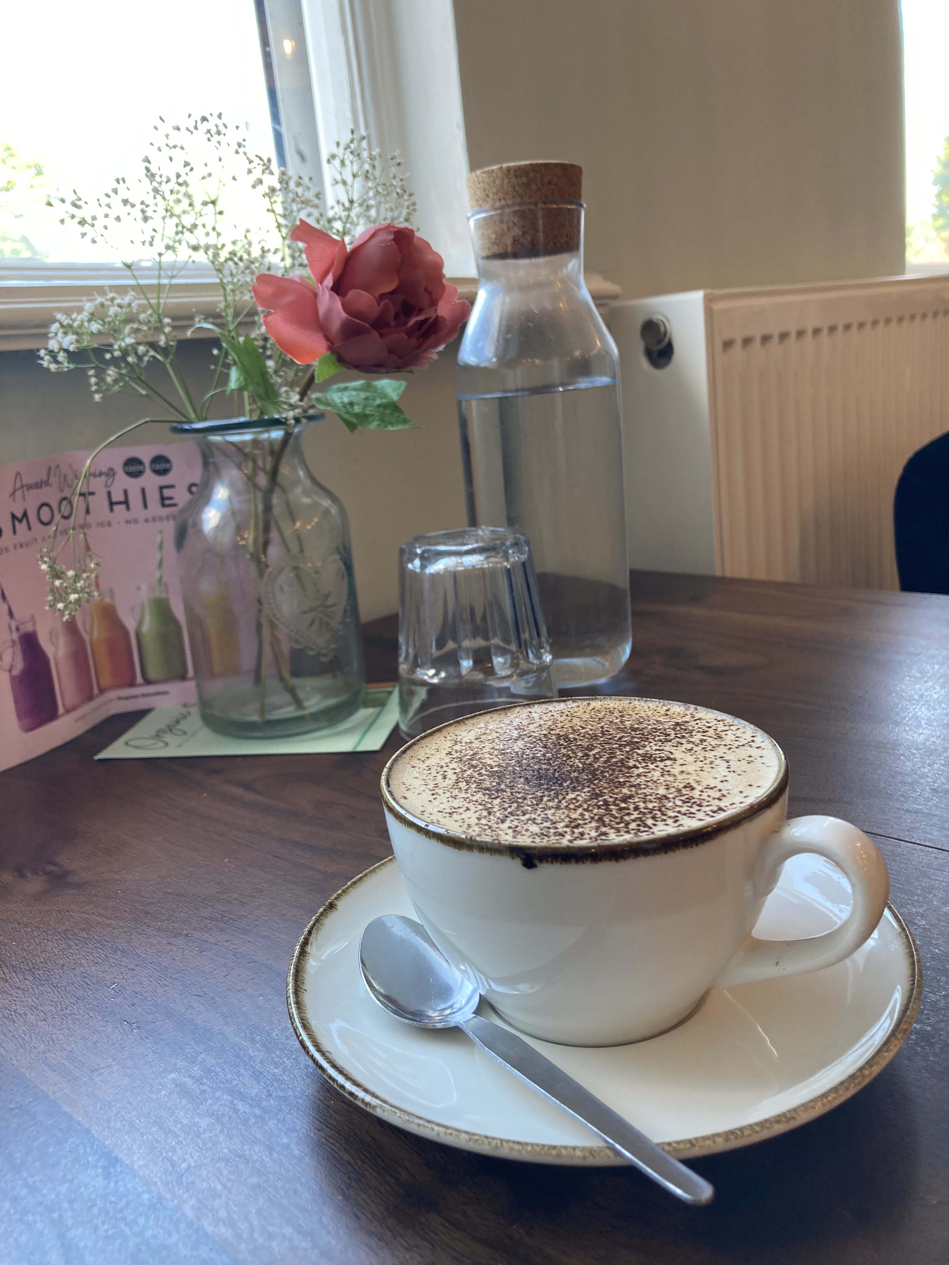 With a lovely chocolate sprinkled cup of cappuccino (I loved their coffee but will probably try one with an extra shot of espresso next time)